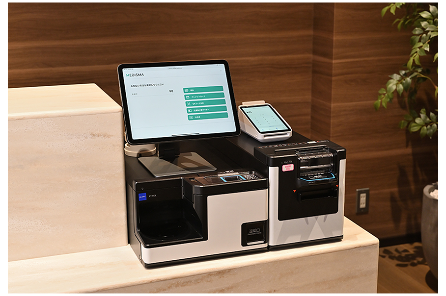 そこに今回の自動釣銭機(セミセルフレジ)はもちろん、自動精算機や電子カルテ、WEB予約、WEB問診なども用意し、クリニックのDX化を体験していただける場所となっております。